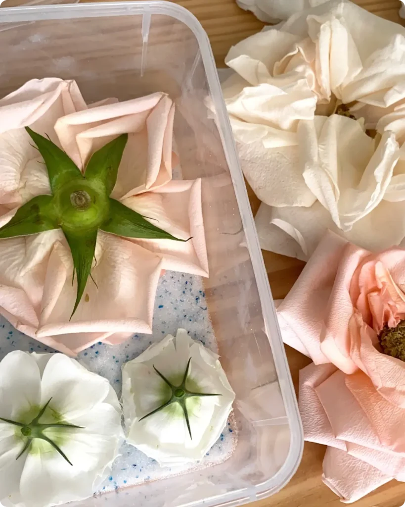 Seal and wait: Close the lid tightly and let the flowers dry for 5–7 days.