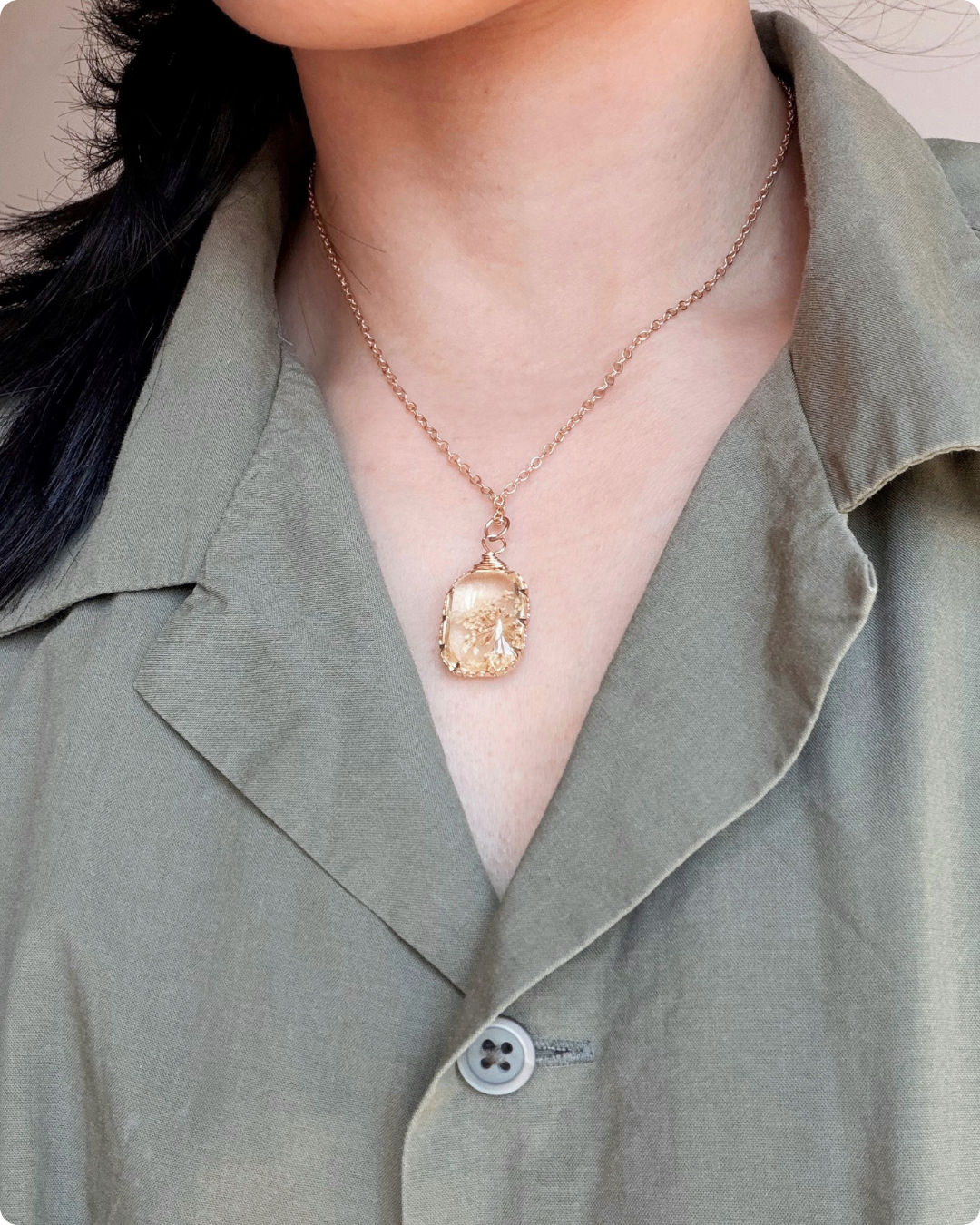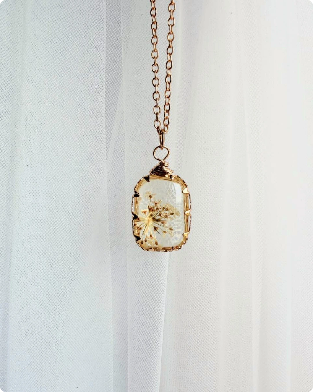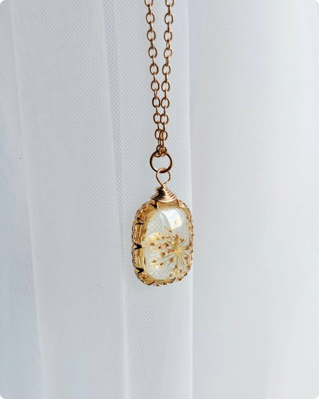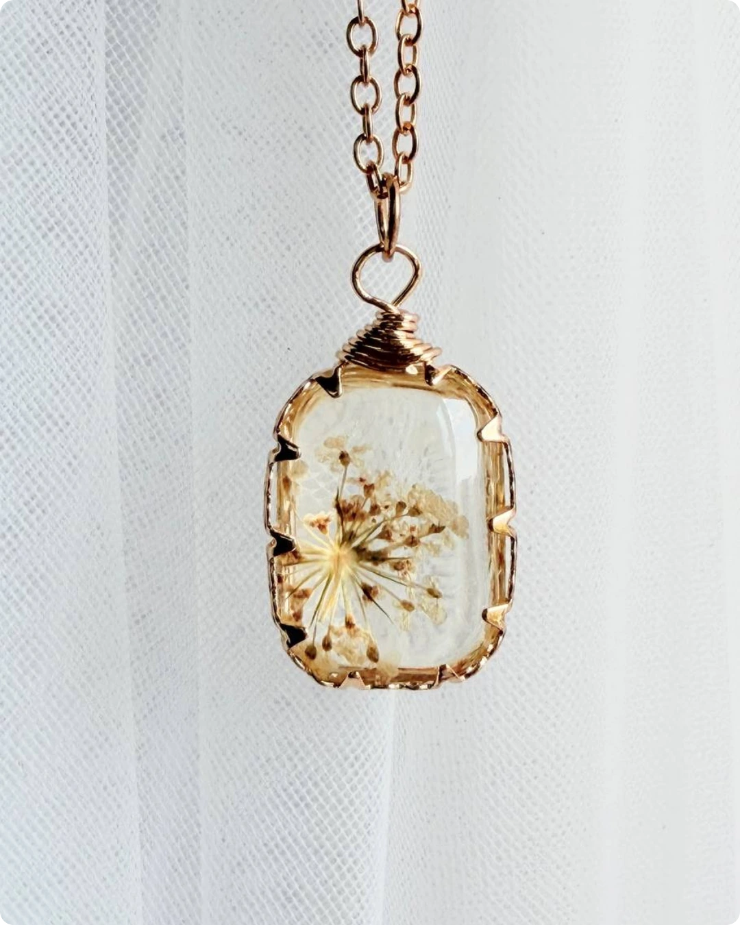 In our case, we use Resin to encapsulate preserved flowers into pendants for necklaces. This method of preservation allows you to carry a precious moment of nature with you, as the florals are frozen in time.