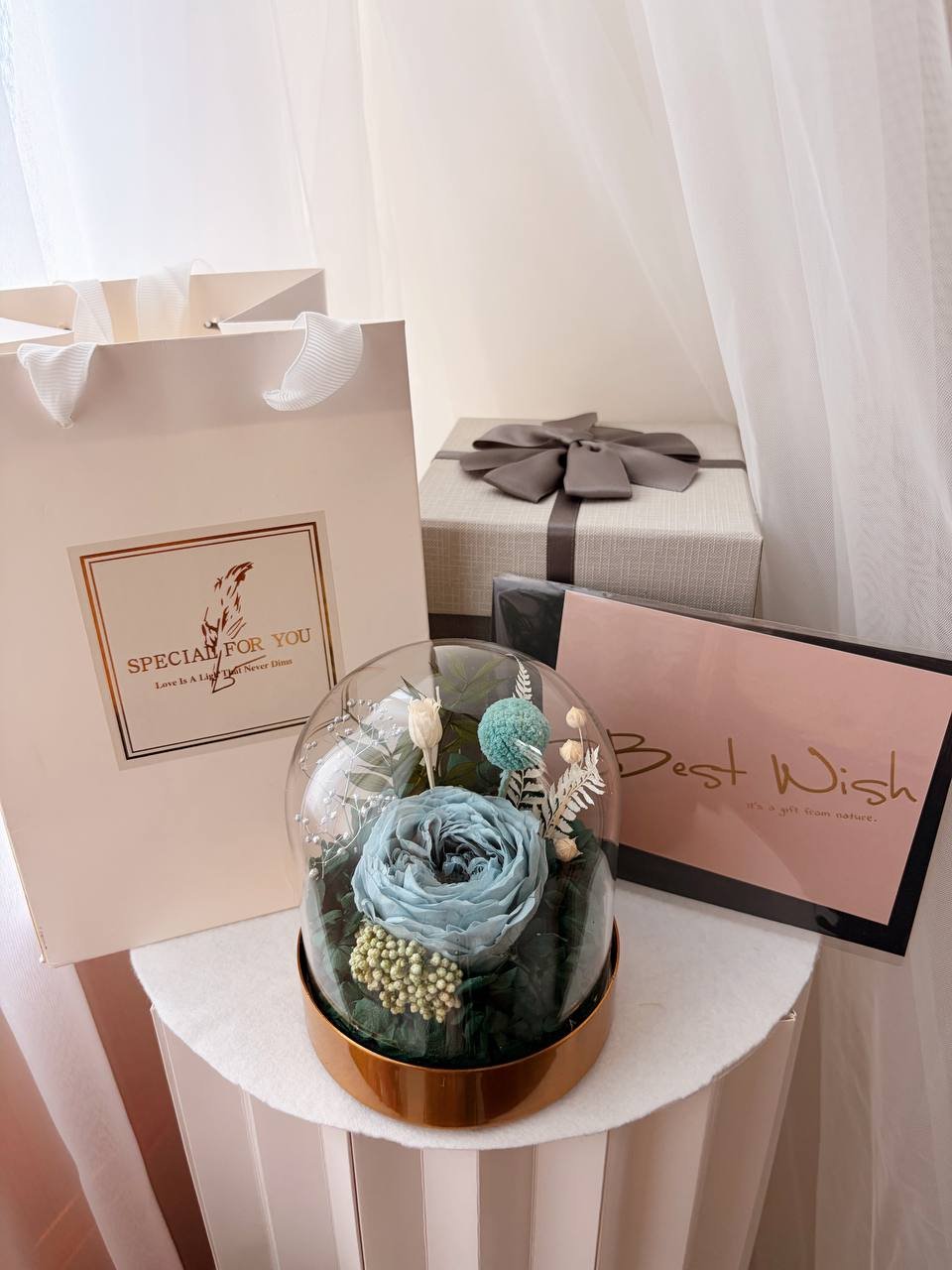While preserved flowers do not wilt, their colours might fade and become less vibrant over time. To prolong their vibrant appearance;